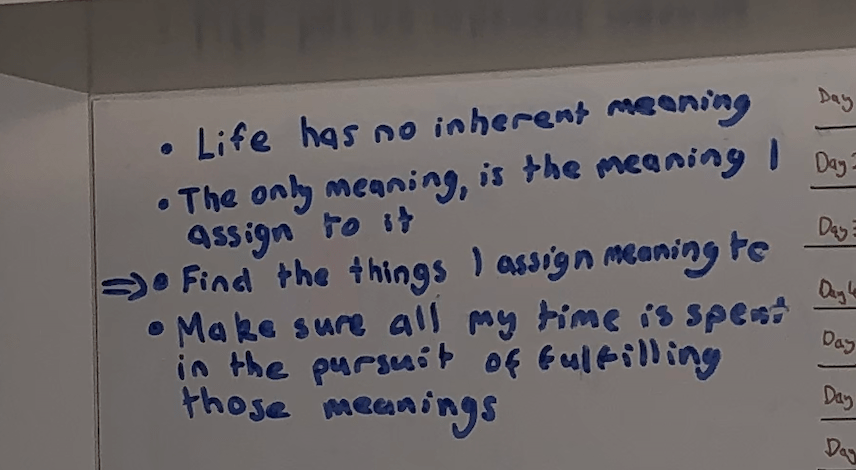 Around the time I turned 23 (2020), I found myself in the throws of a fairly classic existential crisis. Everything seemed meaningless. I was desperately trying to search for meaning. It was becoming increasingly clear to me, that I didn’t believe there was much inherent meaning to life. Gradually I was able to come to the realisation that the meaning of life was simply the meaning I assigned to it.